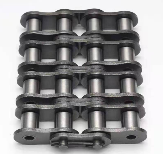 Roller chains can be made into single-strand and multi-strand chains. When it is necessary to withstand larger loads and transmit larger power, multi-strand chains can be used. The multi-row chain is equivalent to several ordinary single-row chains connected with each other by long pins, and its bearing capacity is proportional to the number of rows, but the more rows there are, the more difficult it is to make each row evenly stressed, so the number of rows should not be too much, commonly used are double-row chains and three-row chains. It is a mechanical power chain used for conveyors, a type of chain drive, which is widely used in household, industrial and agricultural machinery, such as plotters, transporters, automobiles, motorcycles, and bicycles. It is linked together by a series of short cylindrical rollers, driven by a gear called a sprocket, and is a simple, reliable transmission of power.