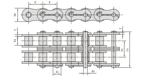 | ANSI 链号 ANSI Chain No. | 链 号 Chain No. | 节距 Pitch | 滚子直径 Roller diameter | 内节内宽 Width between inner plates | 销轴直径 Pin diameter | 销轴长度 Pin length | 内链板高度 Inner plate depth | 链板厚度 Plate thick- ness | 排距 Transverse pitch | 抗拉强度 Tensile strength | 每米长重 Weight per meter | |||