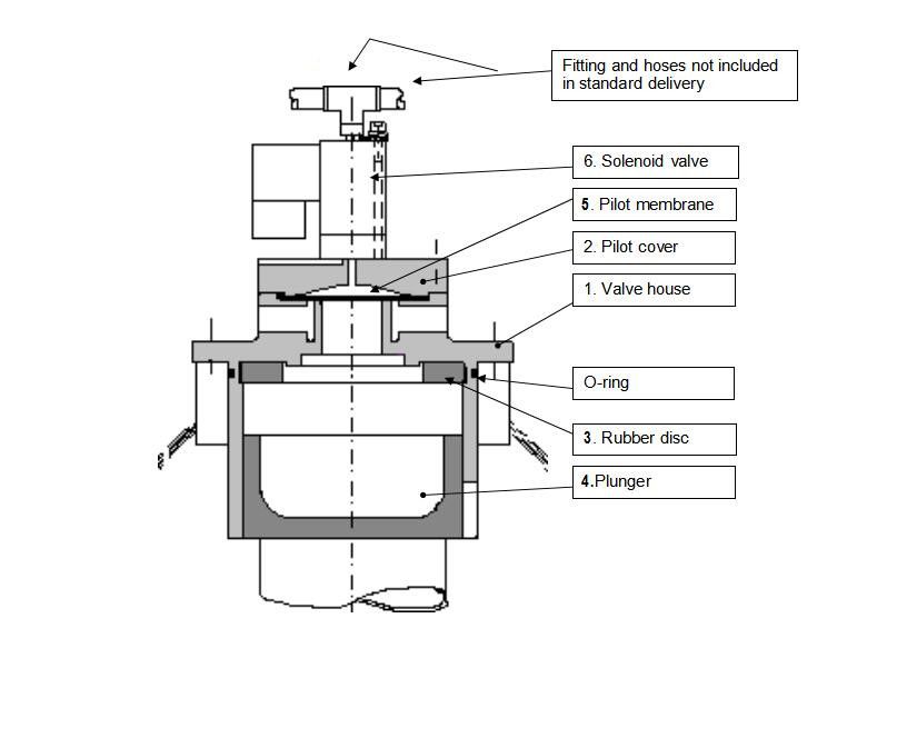 The pressure above the plunger will be equalised to the tank pressure via the slot between the plunger and the horse and the plunger moves down to the pulse pipe and ends the cleaning pulse.
