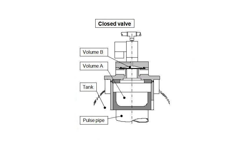 Due to the larger pressurised surface of the plunger in volume A, the plunger is pressed towards the pulse pipe and seals between the pressure tank and the pulse pipe.