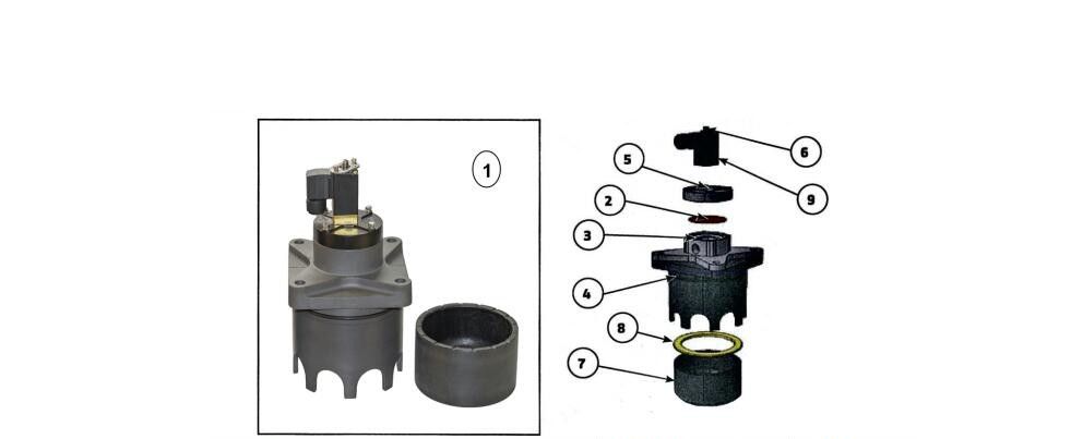 Put the plunger (pos 4) on the top of the pulse pipe. Lubricate the O-ring on the outer side of the valve house (pos 1) and match the house to the plunger. When installing the pulse valve be careful not to damage the O-ring. Tum the house so that the solenoid is pointing in right direction. Screw the four bolts with fingers as long as possible and make then the last setting with tool cross-wise to avoid damages to the O-ring. Torque according to specifications.