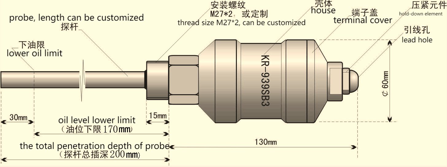 Use installation: KR-939SB3 integrated three-parameter combination probe is installed in the threaded hole on the upper part of the fan gearbox (or other equipment under test) in the form of external threads. The probe rod is inserted into the gearbox to obtain the lubricating oil temperature, lubricating oil level, and box vibration signals in the gearbox, and complete the transmission and output.