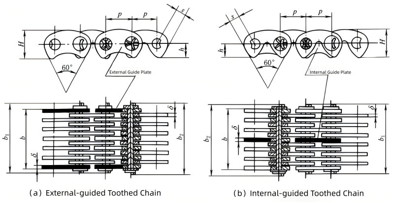 Also known as silent chains, toothed chains are a type of transmission chain. Their fundamental structure consists of alternating toothed chain plates and guide plates connected by pins or combined hinge elements, with adjacent pitch sections forming hinged links. The working surface of the chain plates is typically flat, featuring a 60° angle that meshes with the profile plane of the sprocket teeth. The 30° tooth angle on the chain plates prevents lateral movement.
